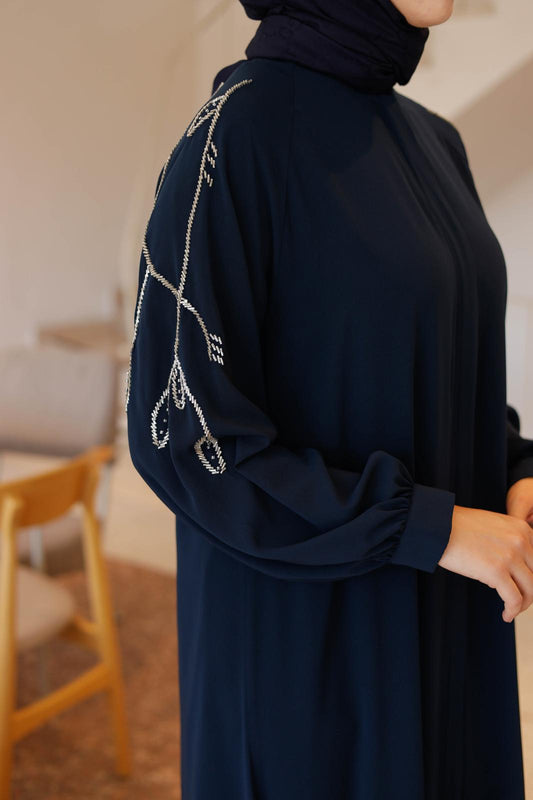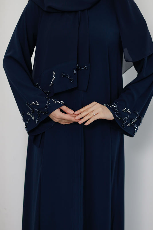 İthal Medine İpeği Fermuarlı Ferace | Boncuk İşlemeli | Siyah & Lacivert | 38-46 Beden