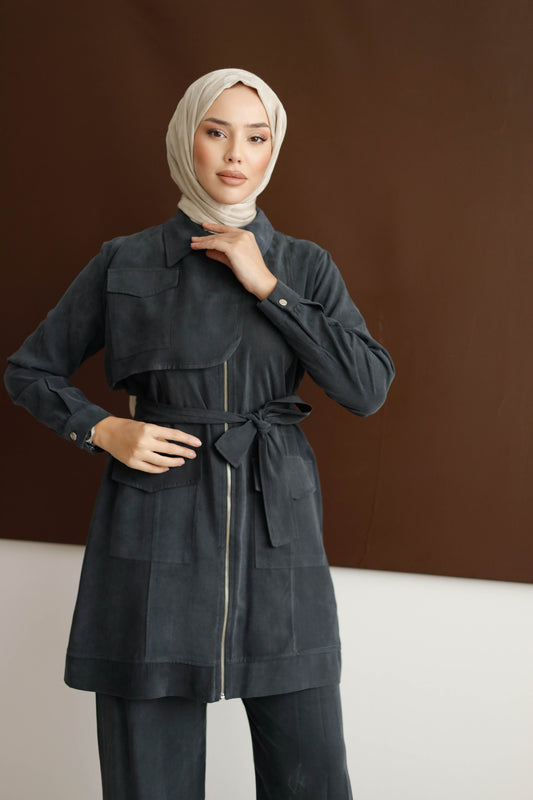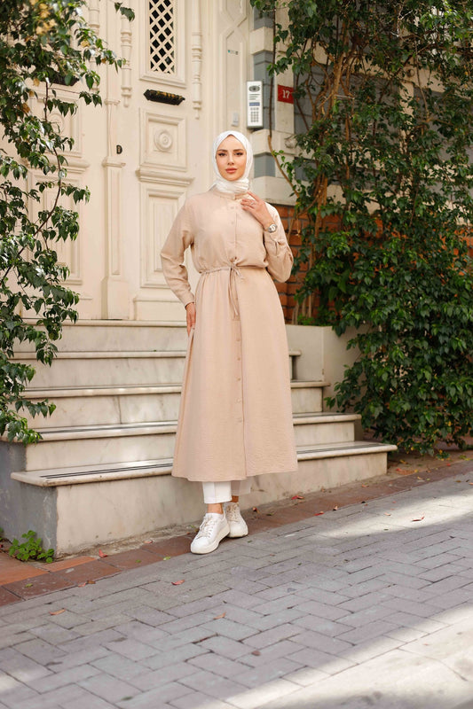 Organik Kumaş Kuşaklı Taşlanmış Kupra Gömlek Ferace – Büzgü ve Nervür Detaylı
