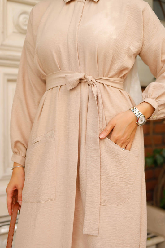 %100 Pamuk Oversize Yaka Kuşaklı Tesettür Düğmeli Elbise (5 Renk Seçeneği - 38/44 Beden)