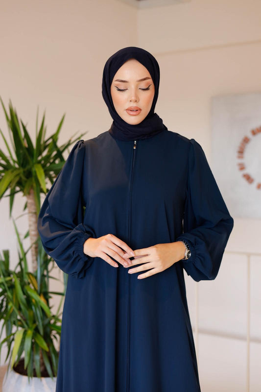 İthal Medine İpeği Fermuarlı Ferace | Boncuk İşlemeli | Siyah & Lacivert | 38-46 Beden