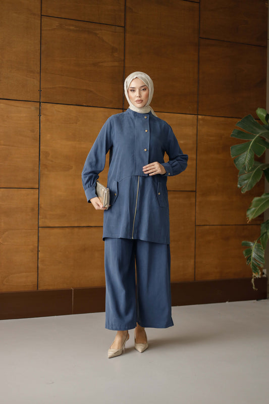 Tensel Kumaş Oversize Tesettür İkili Takım – Bej & Mavi Renk Seçenekli