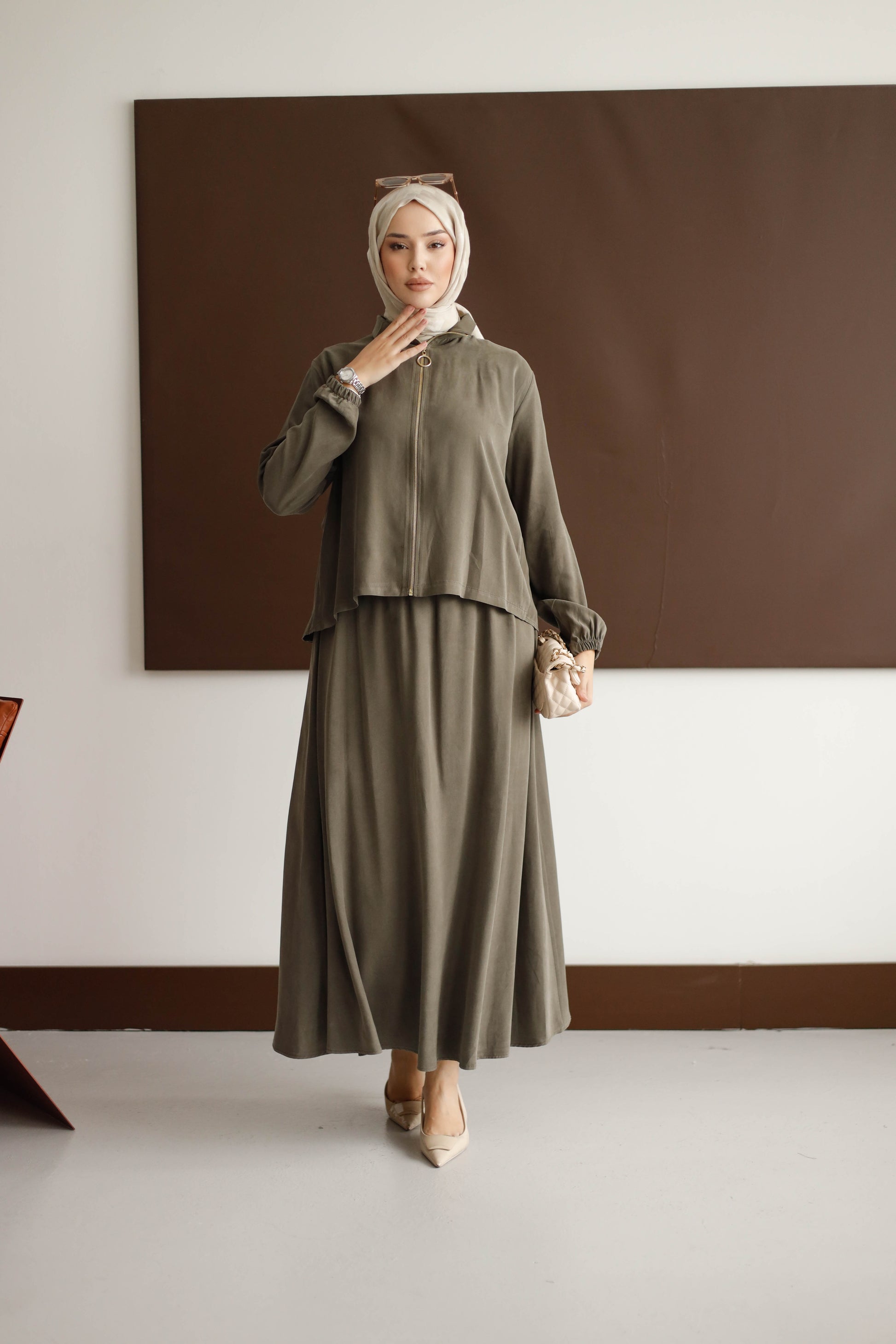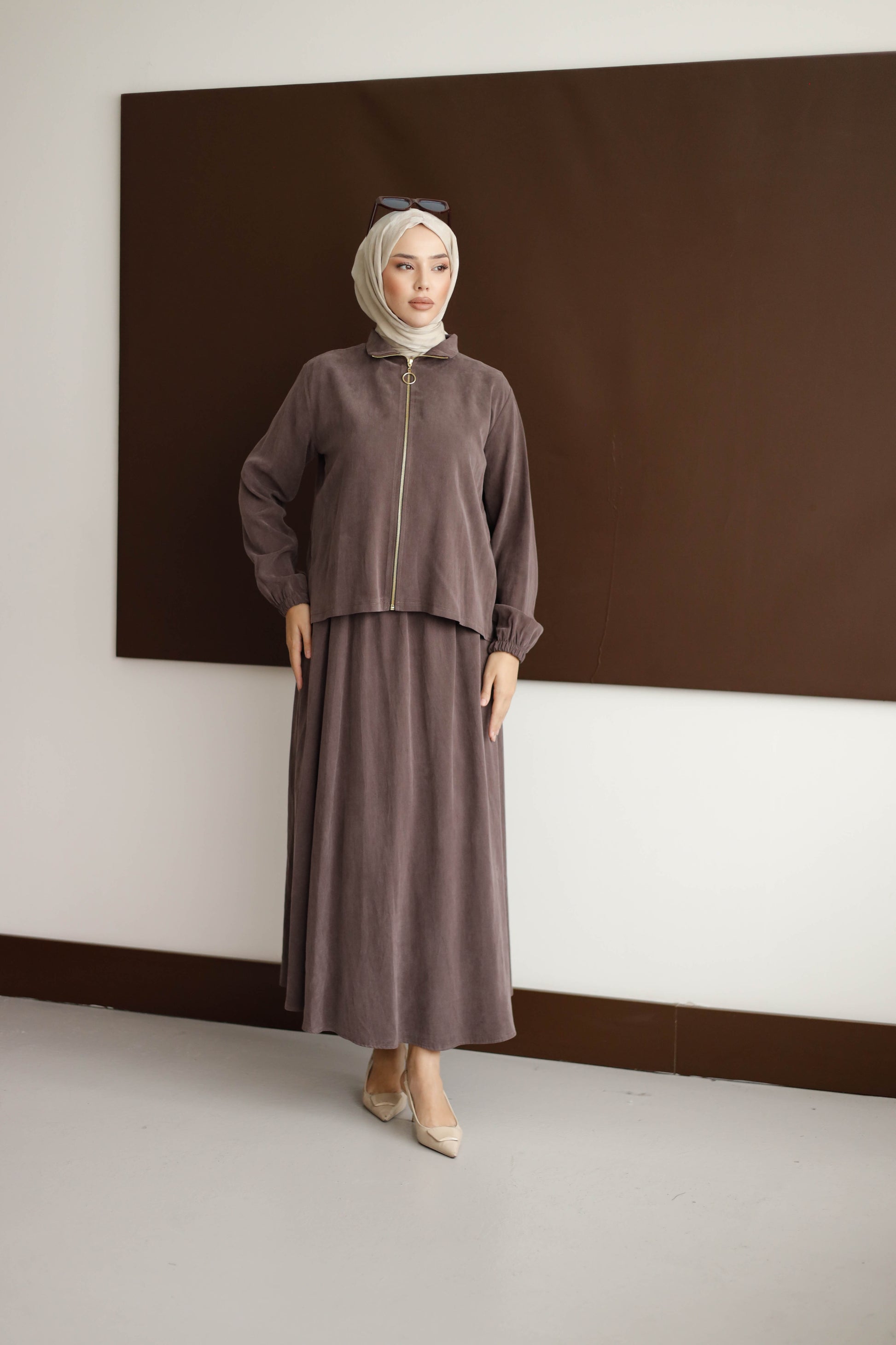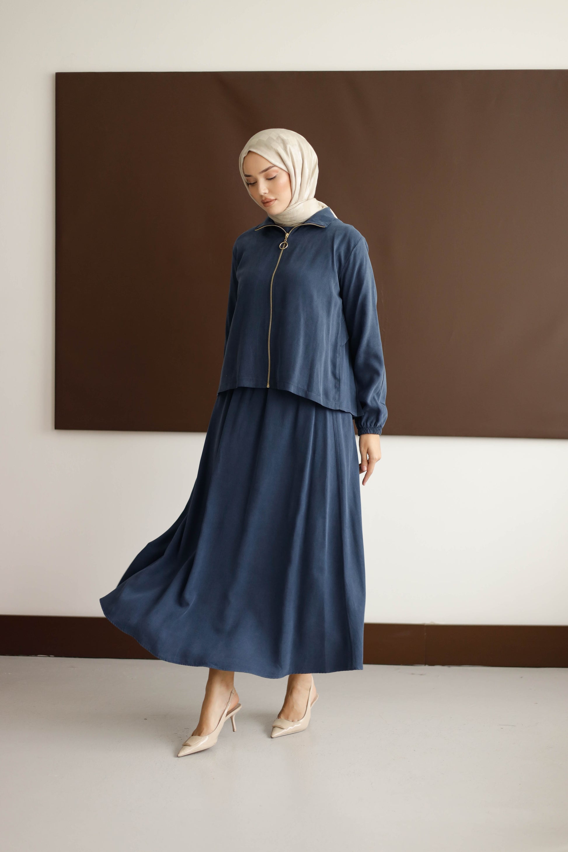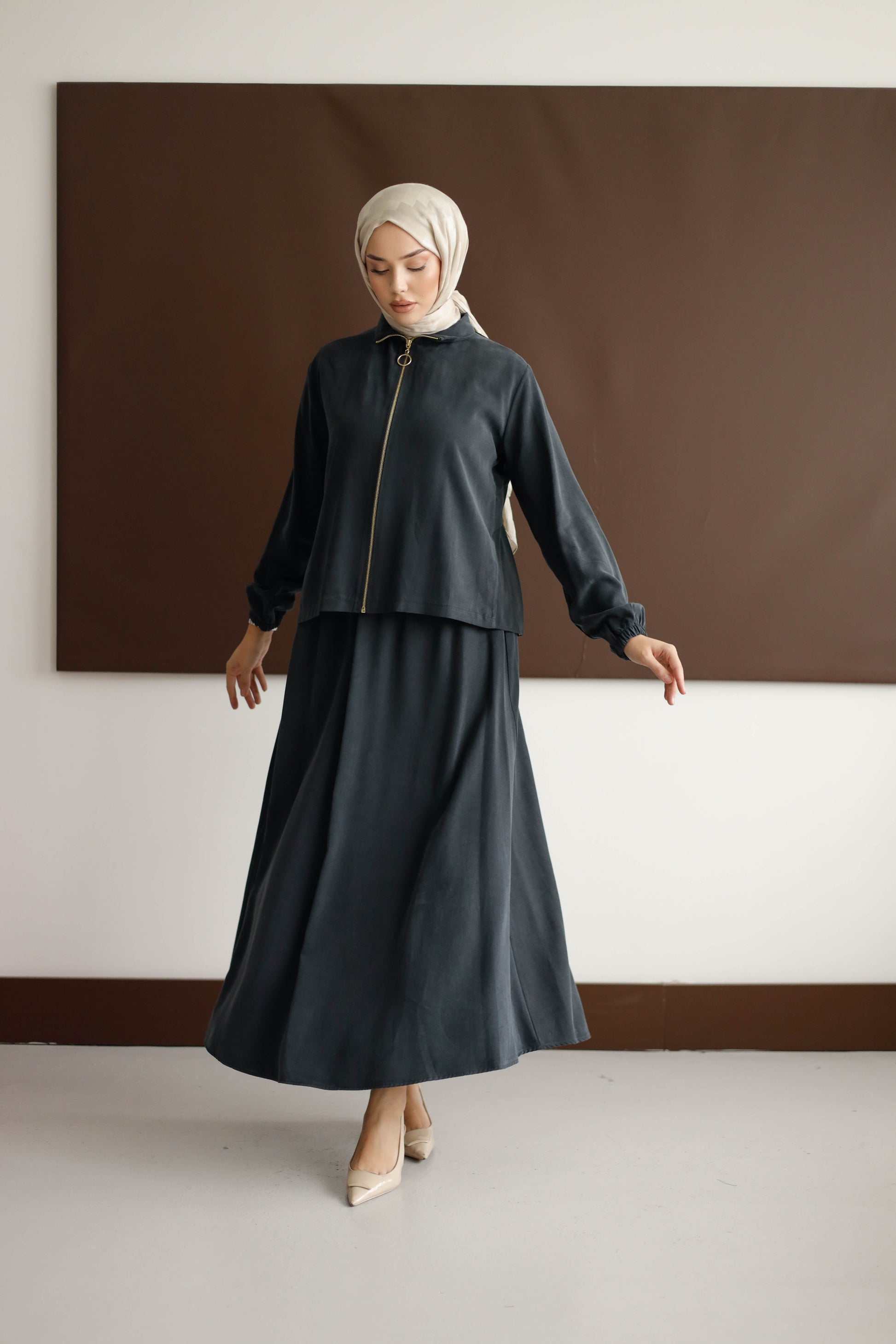 Eteğin dökümlü duruşu, 100 cm boyuyla modern bir silüet oluştururken; arka kısmındaki plise detaylı blüz, her hareketinde zarafet katıyor.