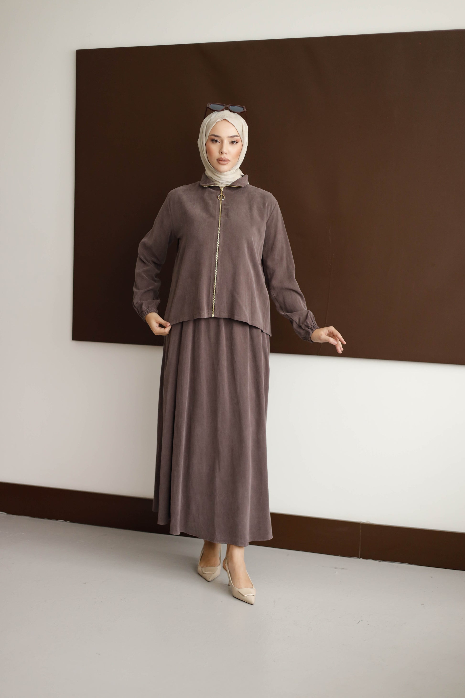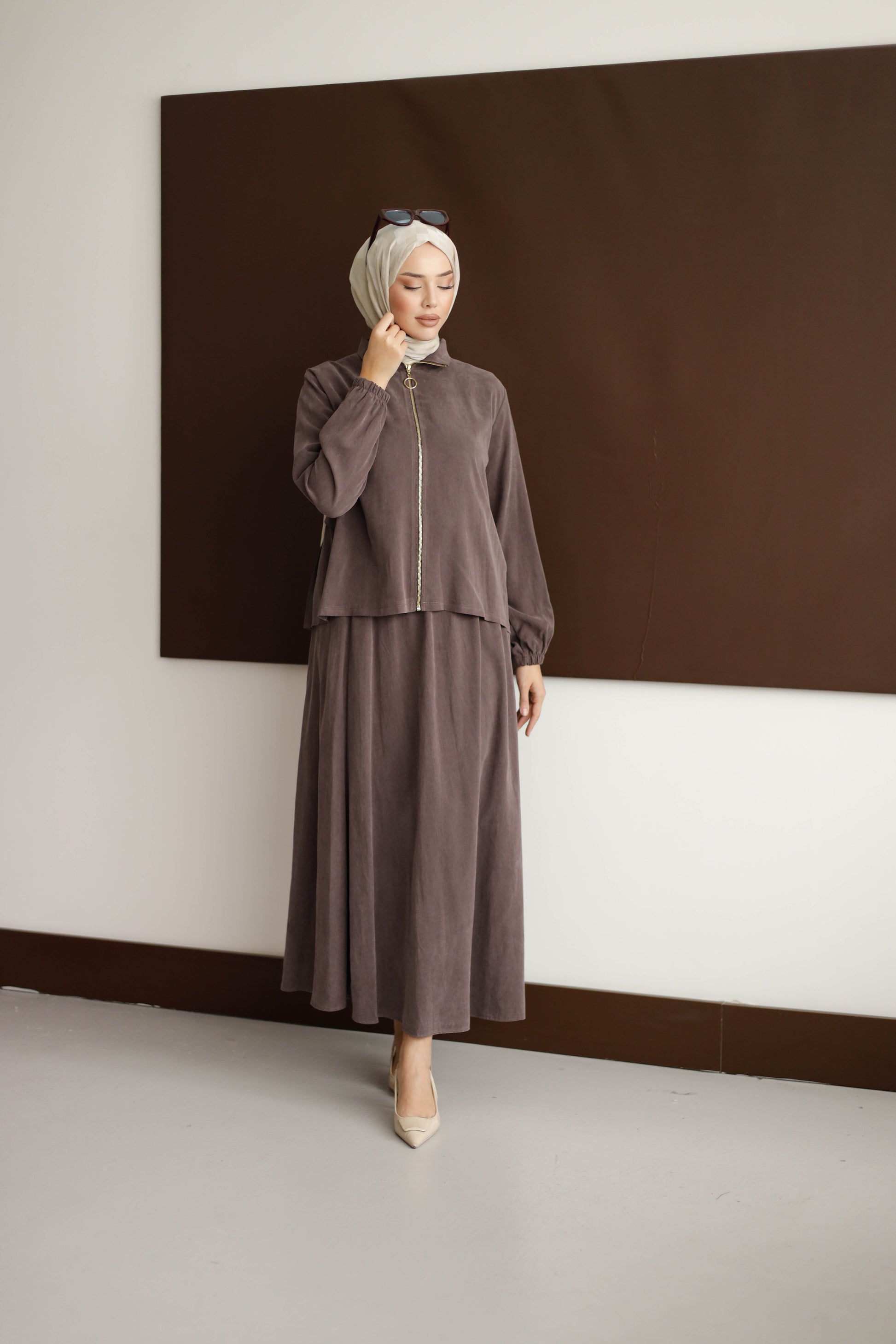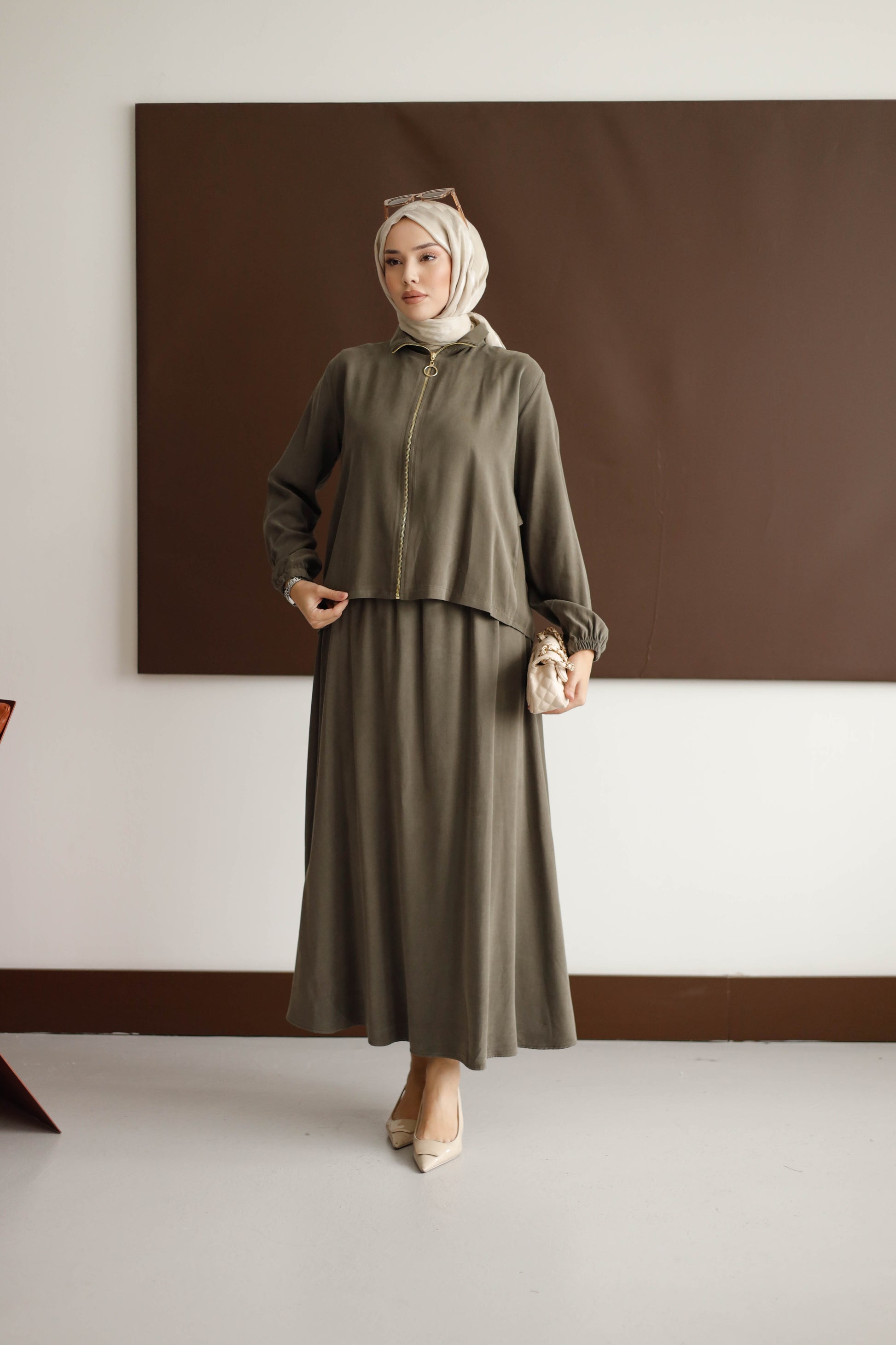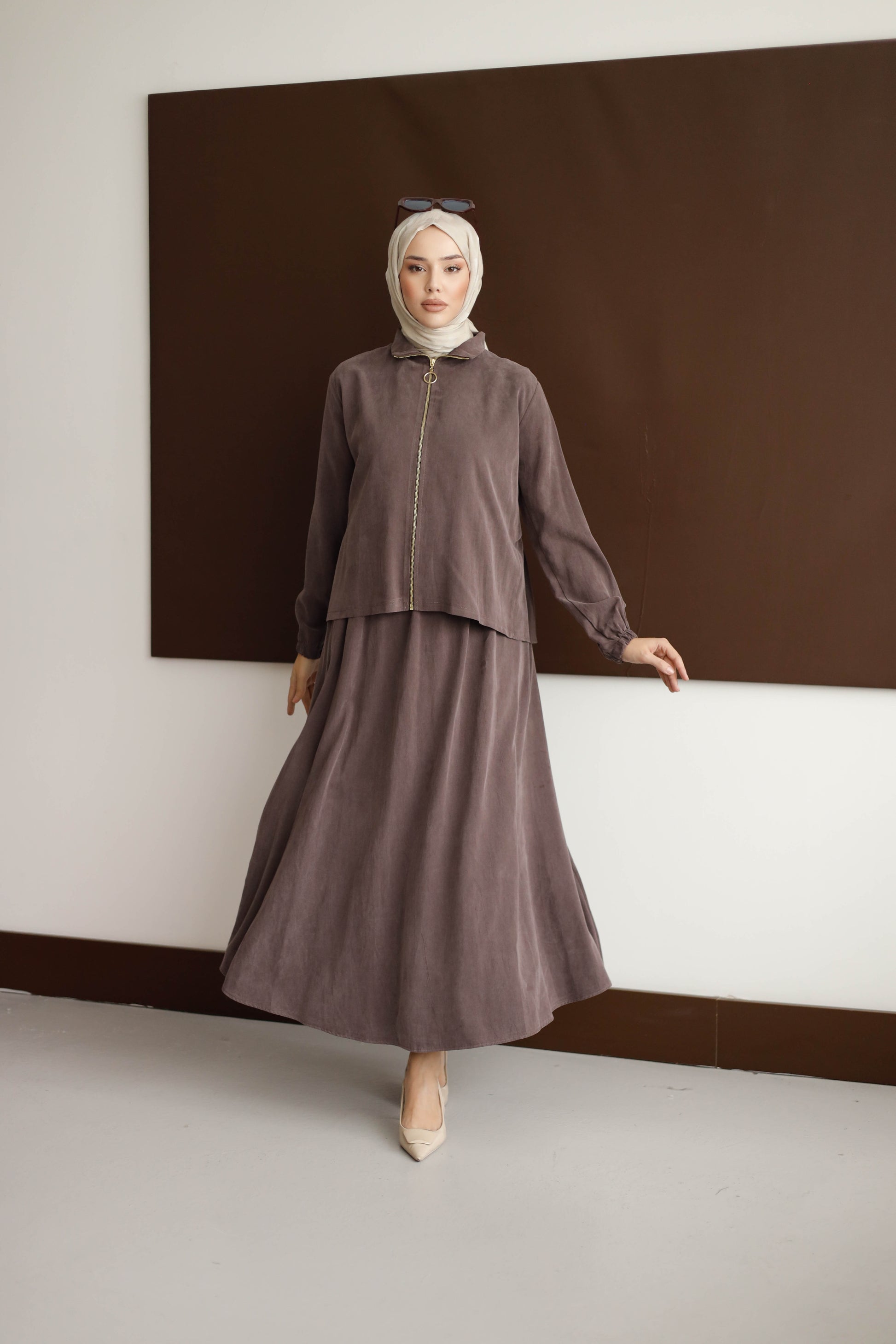 Eteğin dökümlü duruşu, 100 cm boyuyla modern bir silüet oluştururken; arka kısmındaki plise detaylı blüz, her hareketinde zarafet katıyor.