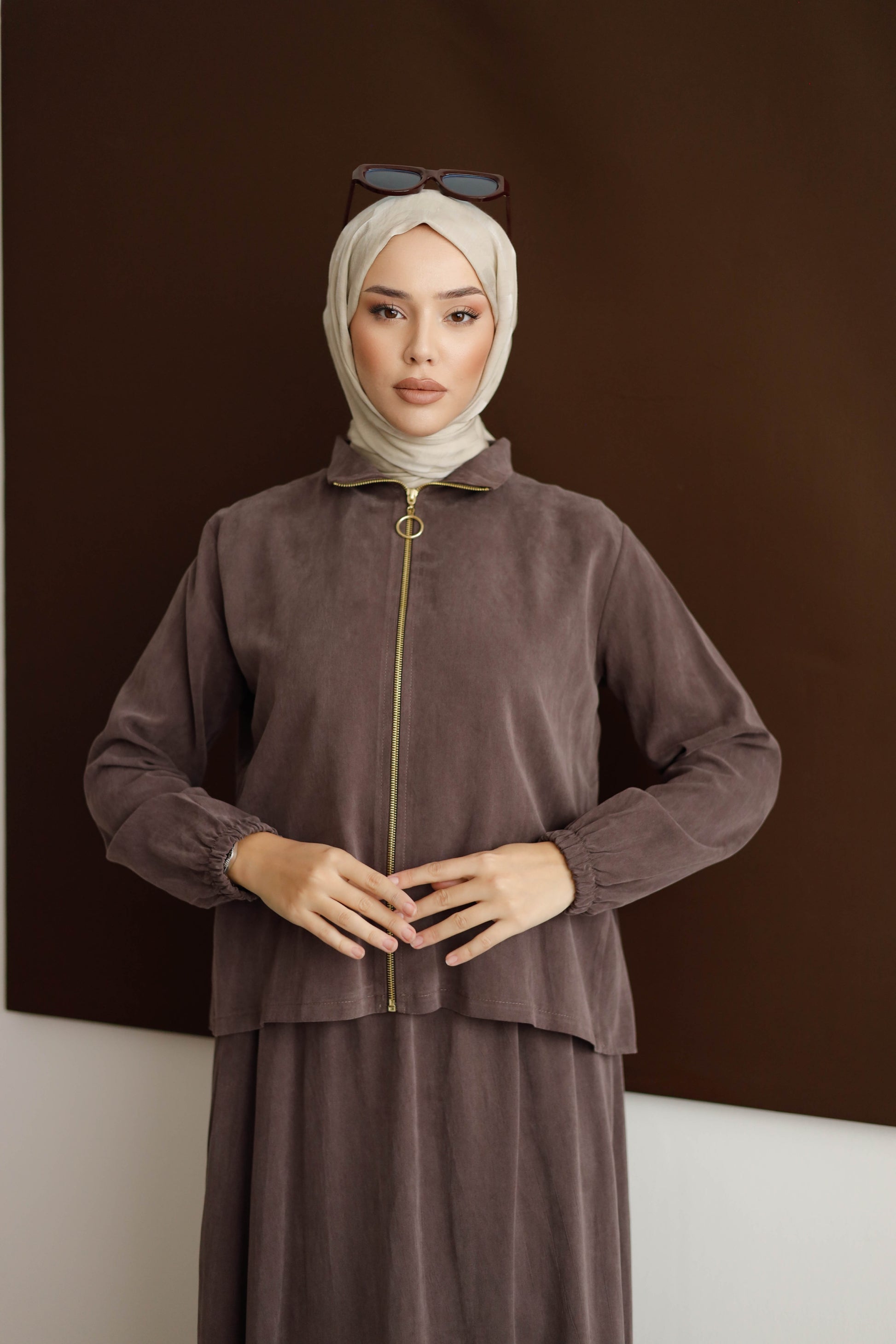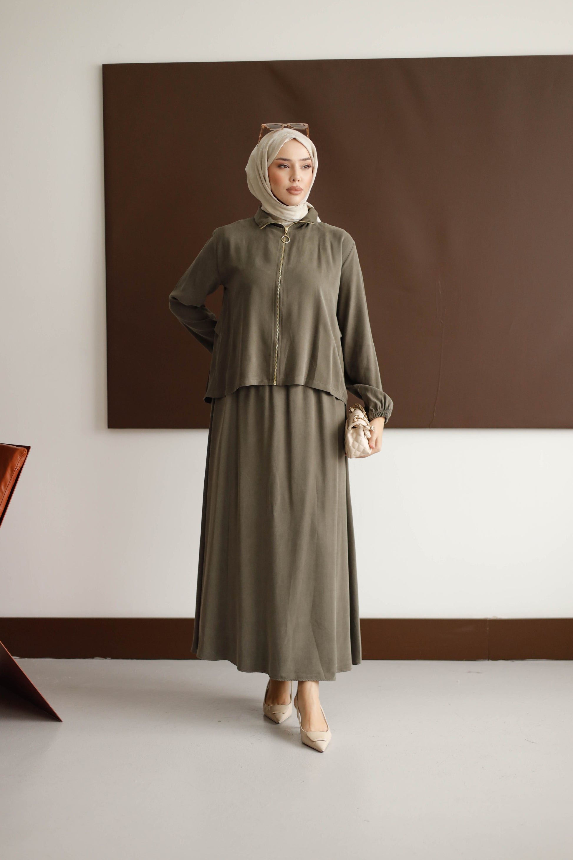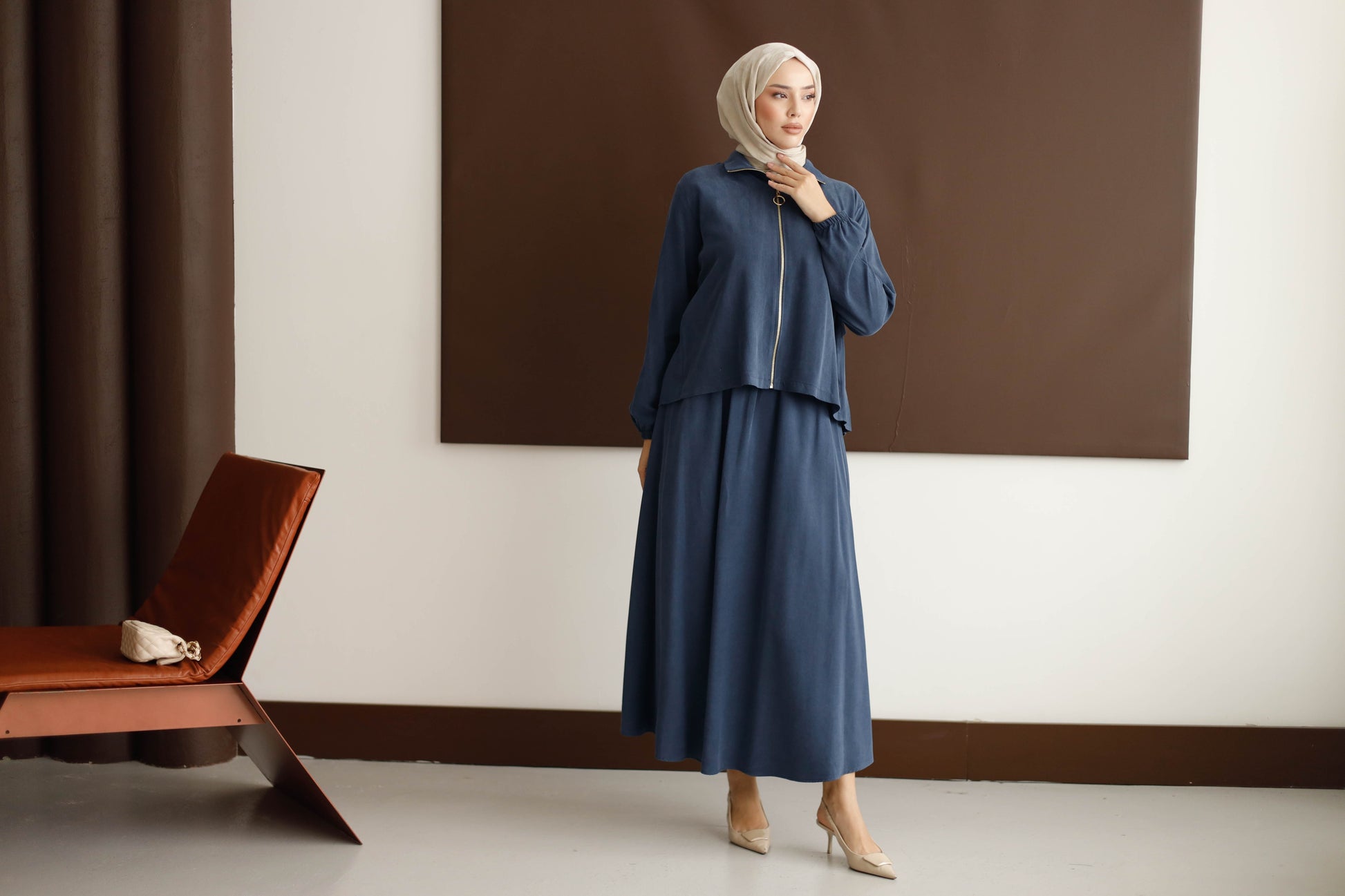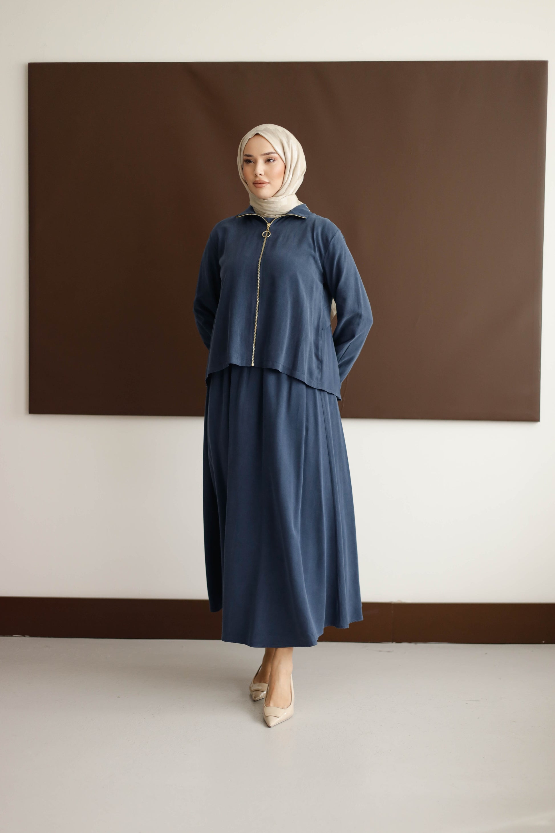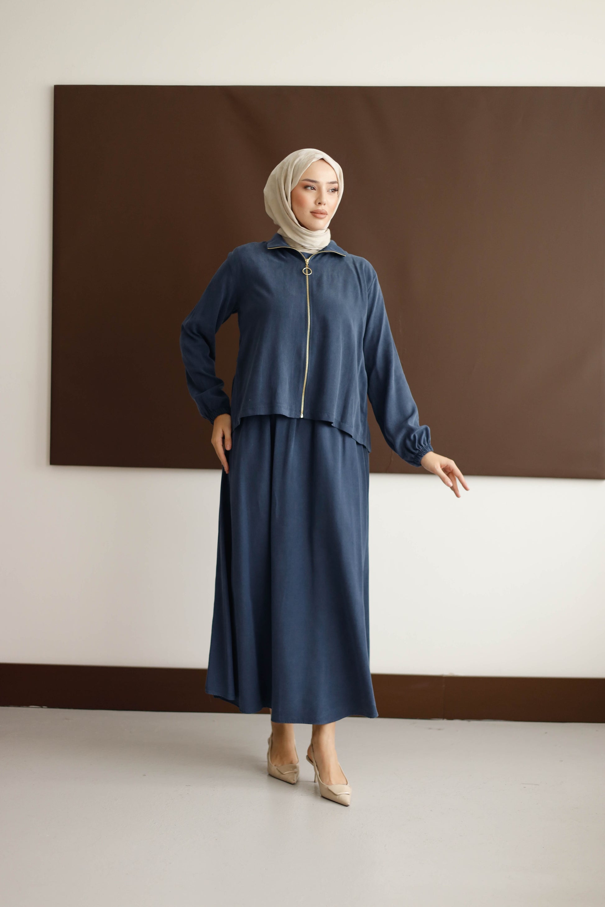 Eteğin dökümlü duruşu, 100 cm boyuyla modern bir silüet oluştururken; arka kısmındaki plise detaylı blüz, her hareketinde zarafet katıyor.