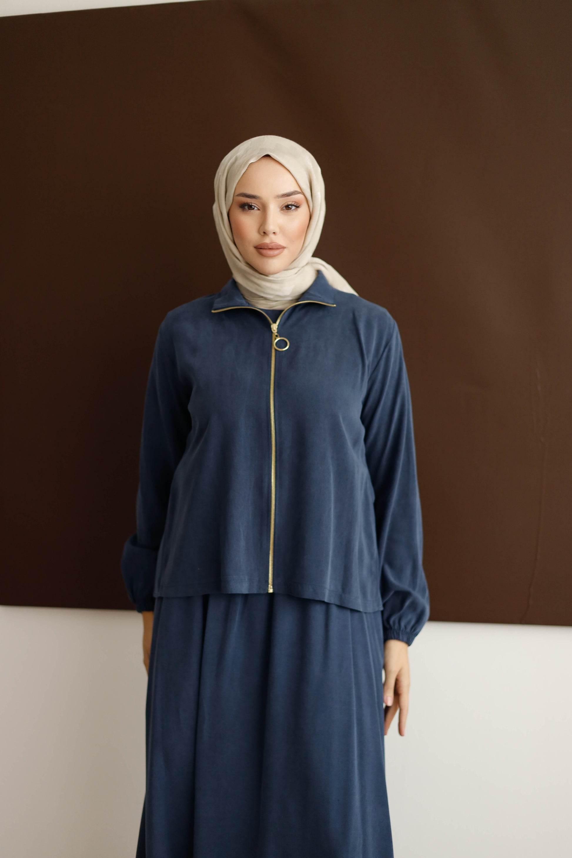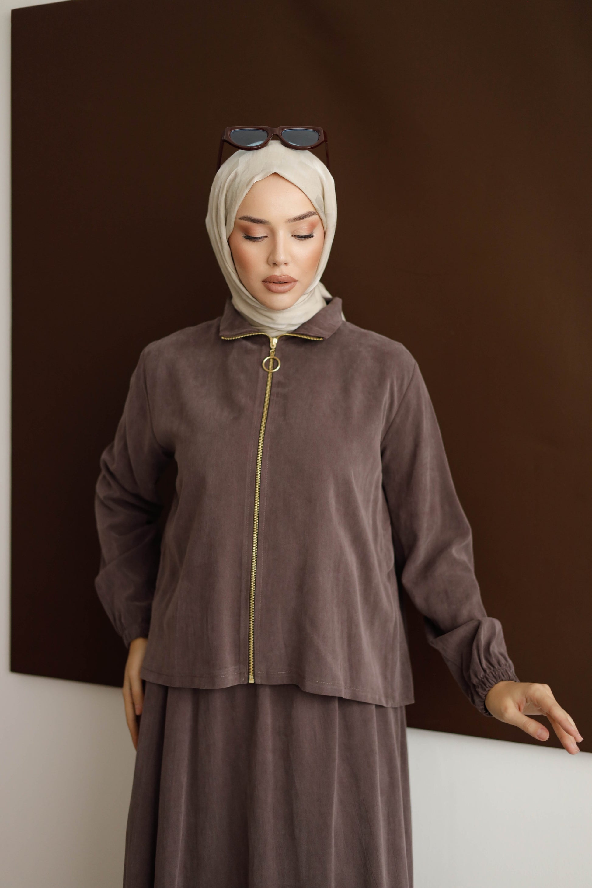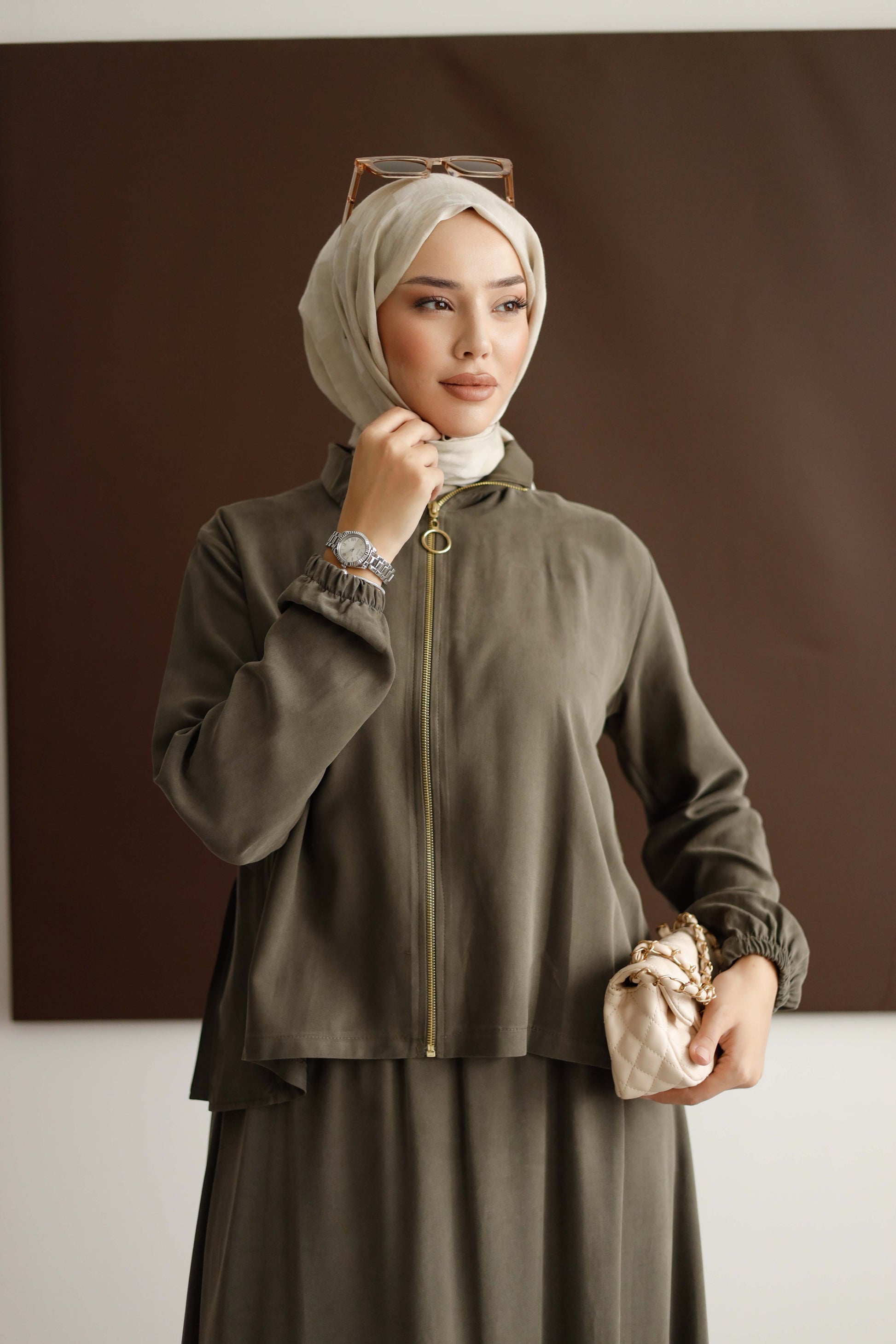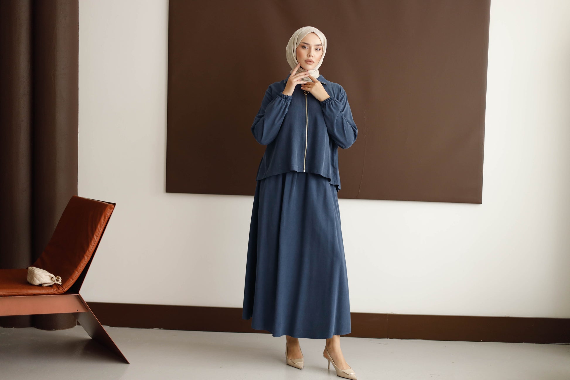 Eteğin dökümlü duruşu, 100 cm boyuyla modern bir silüet oluştururken; arka kısmındaki plise detaylı blüz, her hareketinde zarafet katıyor.