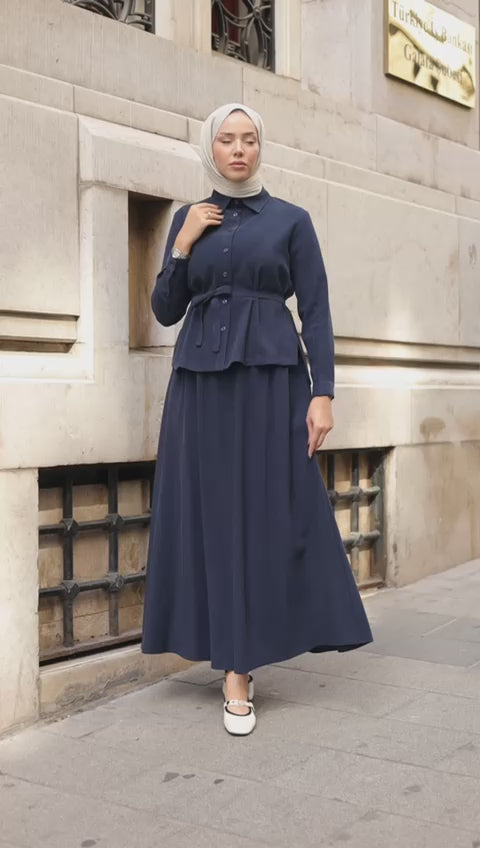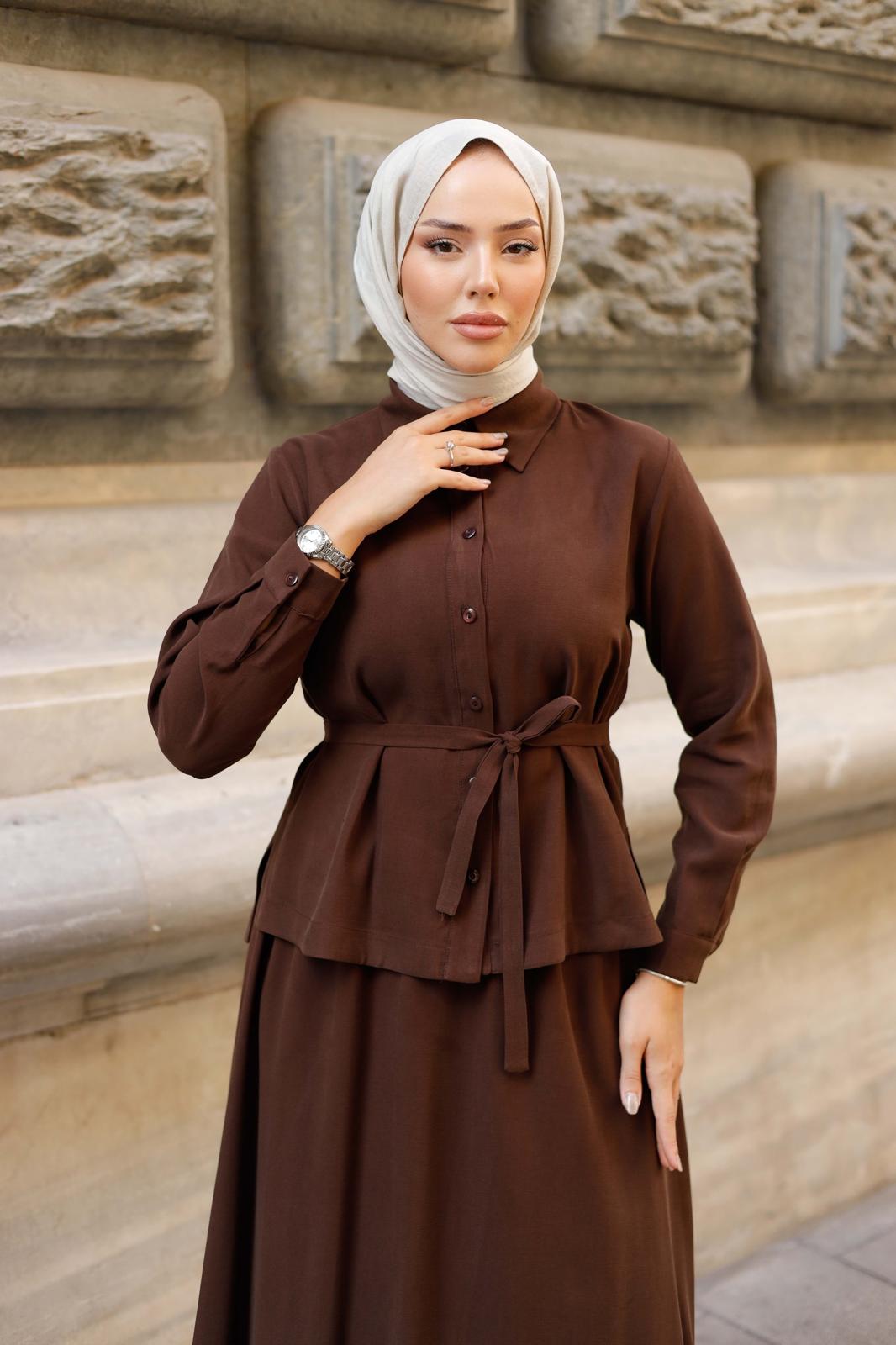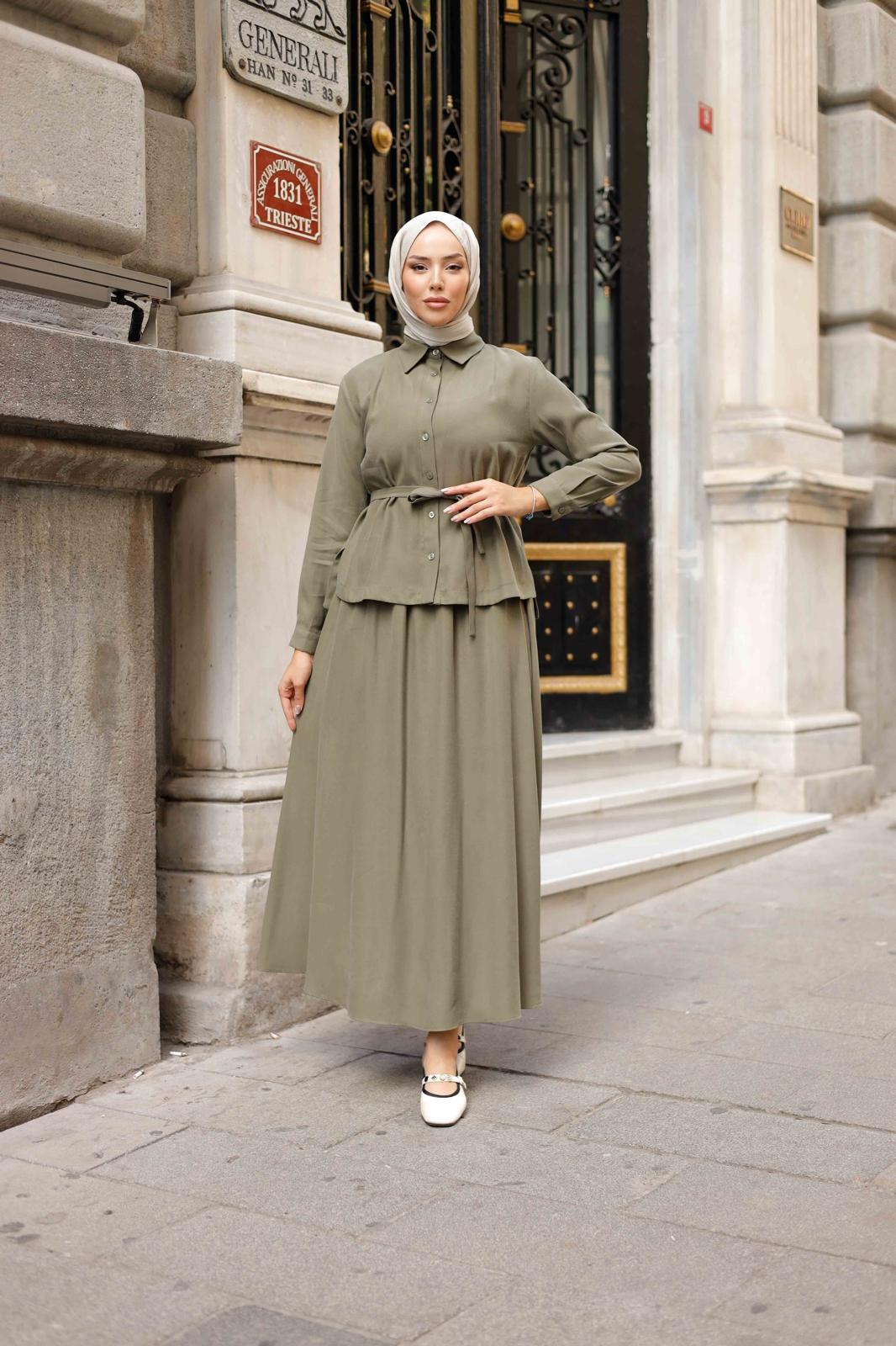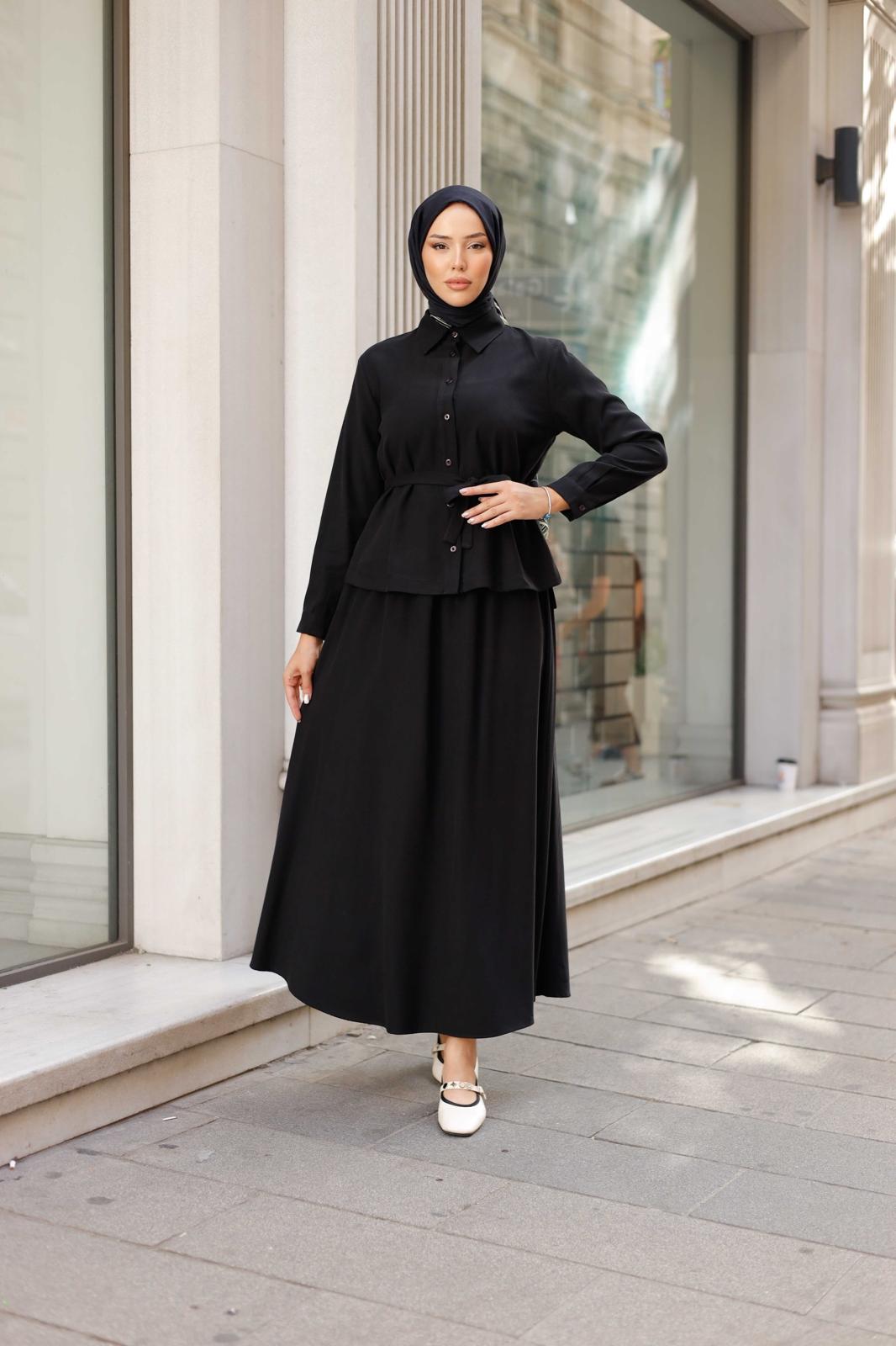 Modern şıklık ve zarafeti bir araya getiren Tensel Kumaş Etekli Takım, Nueny Prive koleksiyonunun sade ama etkileyici parçalarından biri. Kuşak detaylı düğmeli üstü ve akıcı formdaki eteğiyle hem günlük hem de özel kombinleriniz için ideal bir seçim.
