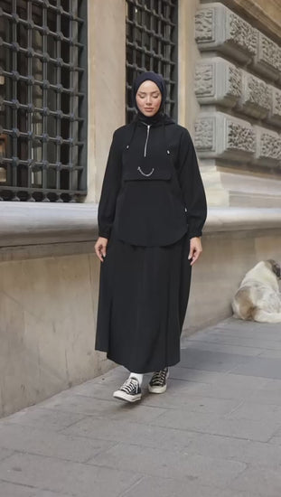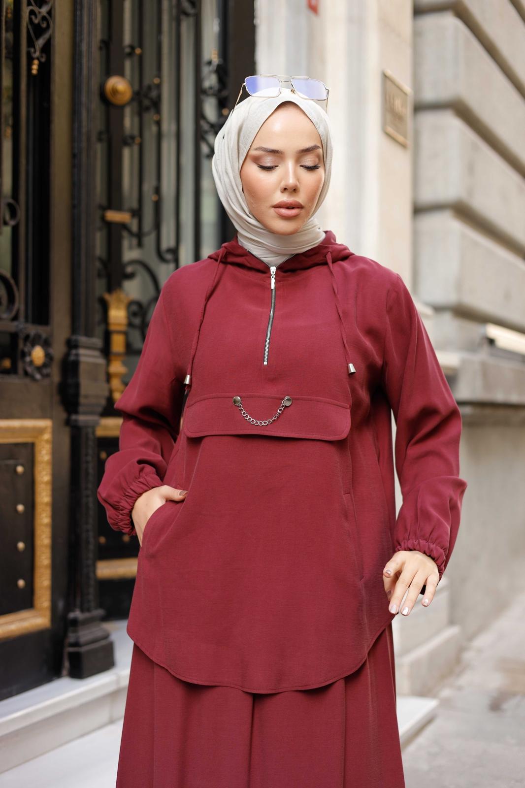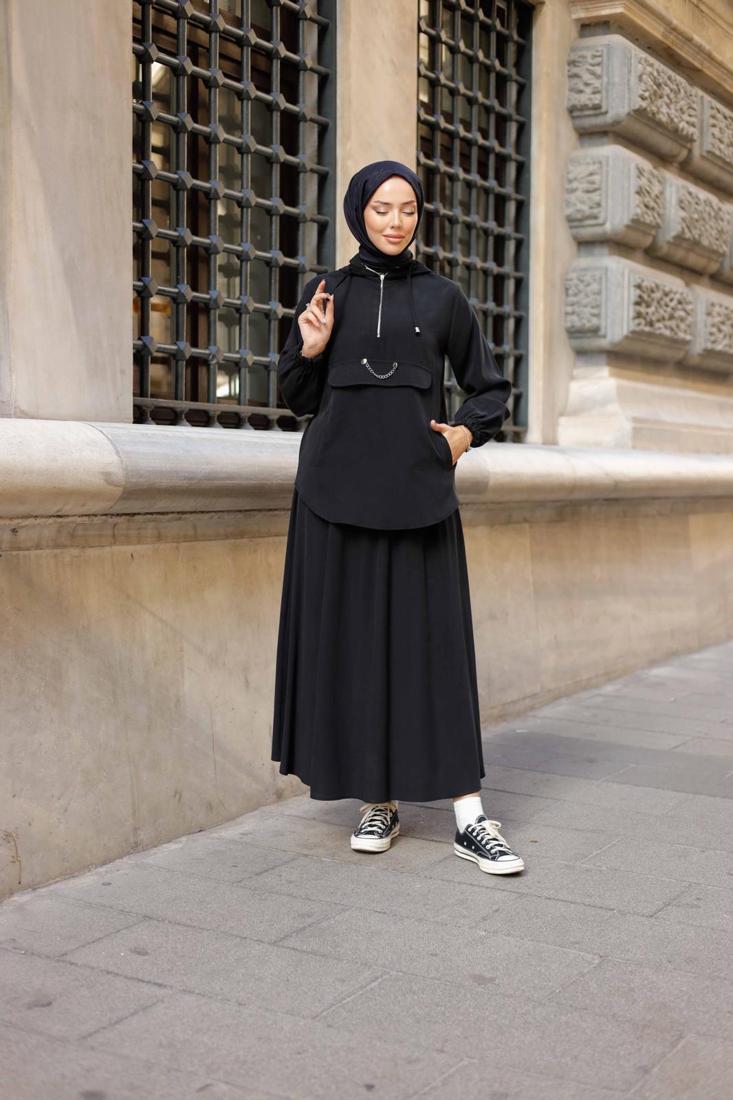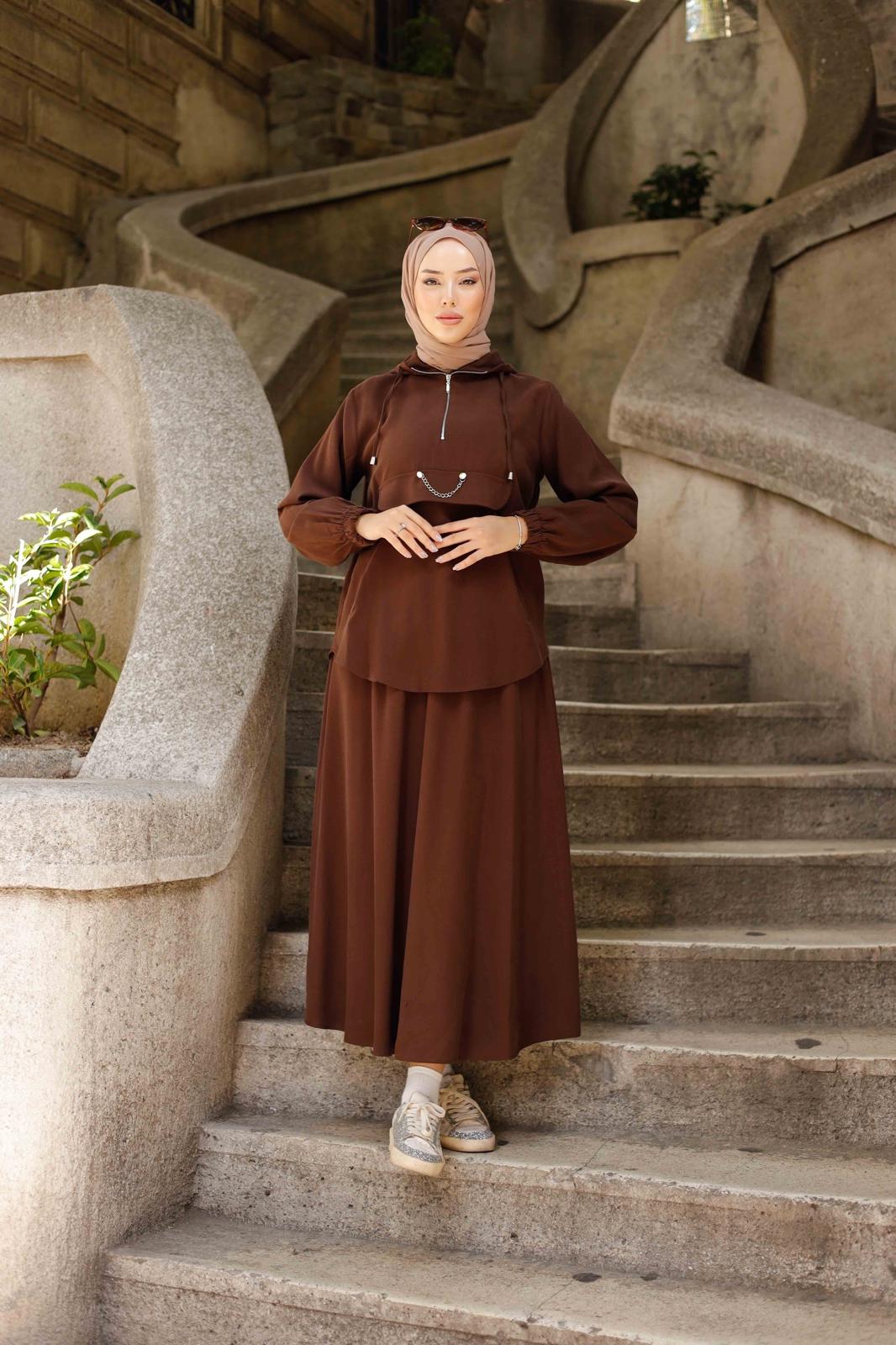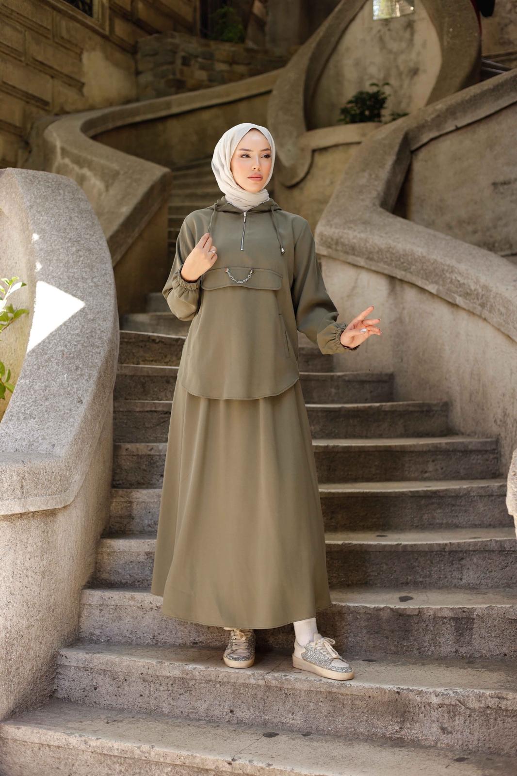 Takım içeriğinde  tunik ve etek yer alır. Oversize kalıbı sayesinde vücuda yapışmadan dökümlü bir duruş sağlar. Gündelik giyimden iş kombinlerine kadar pek çok alanda şık ve sade bir görünüm elde edebilirsiniz.